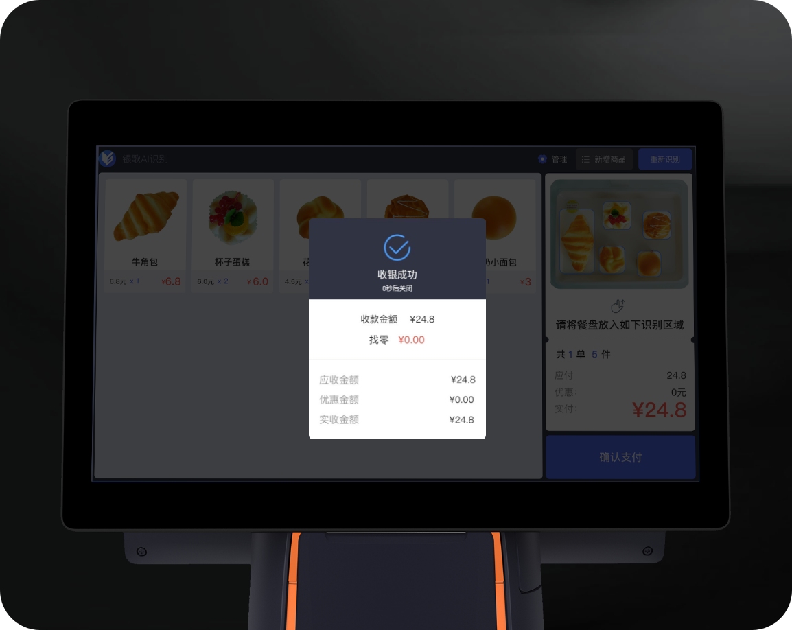 银歌AI视觉结算台,通过图像识别技术让商家实现快速收银,无需学习快速上手,加快店员收银效率,解放收银时间提升服务品质。