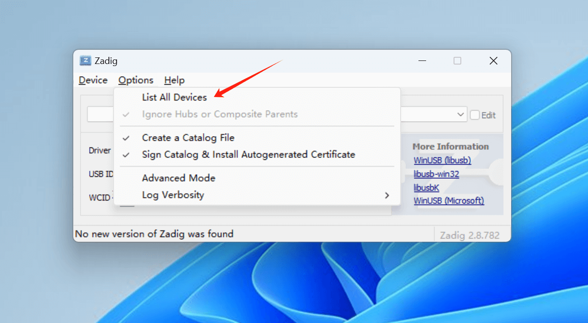 2,安装zadig,点击zadig.exe,步骤如下图: