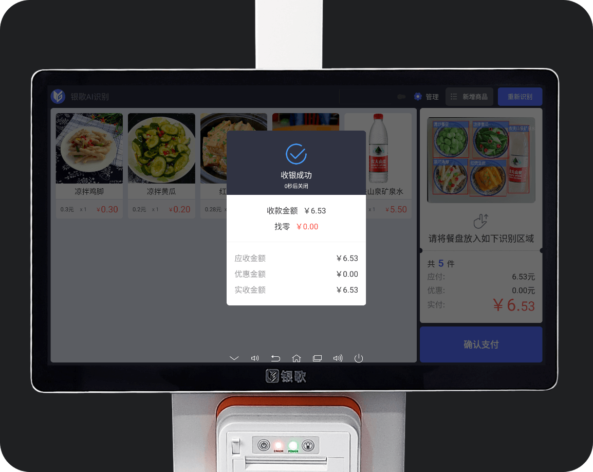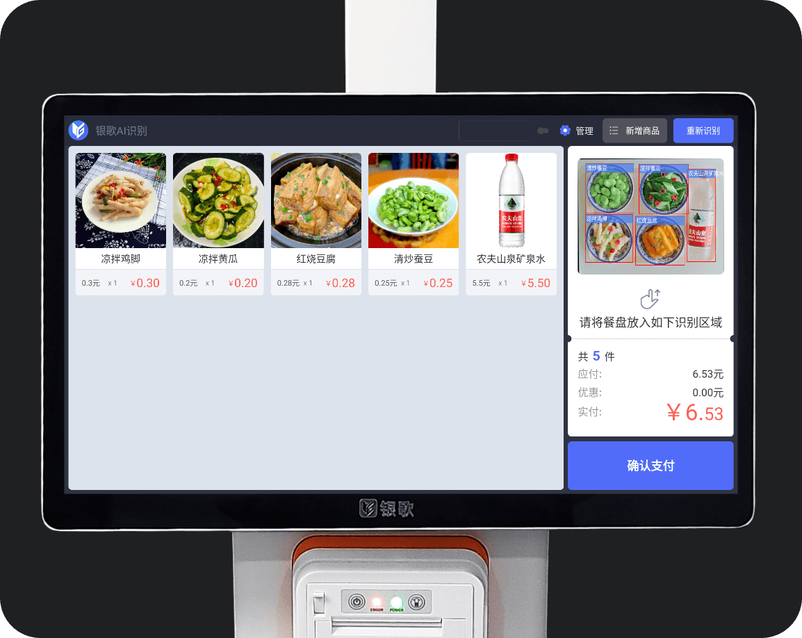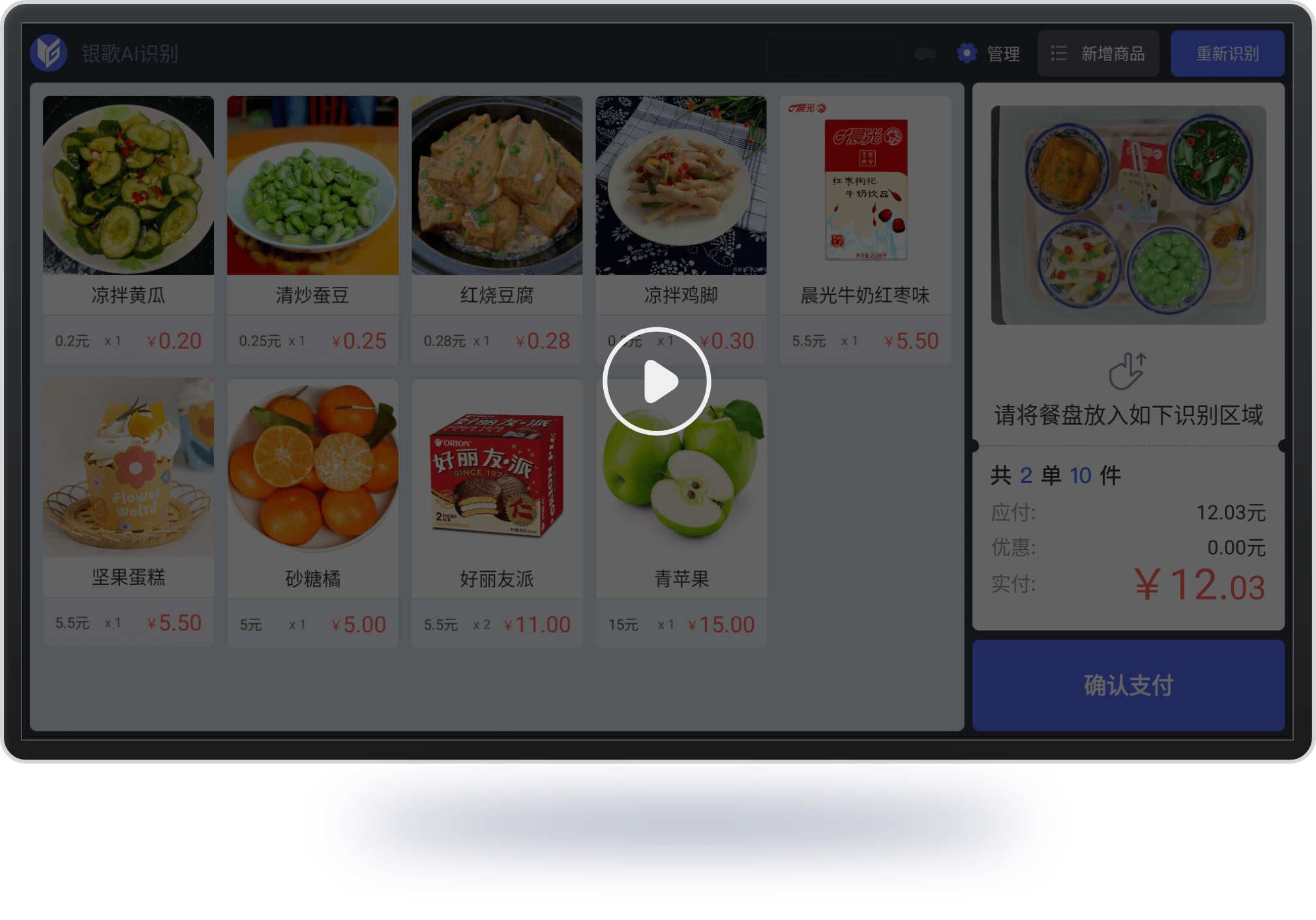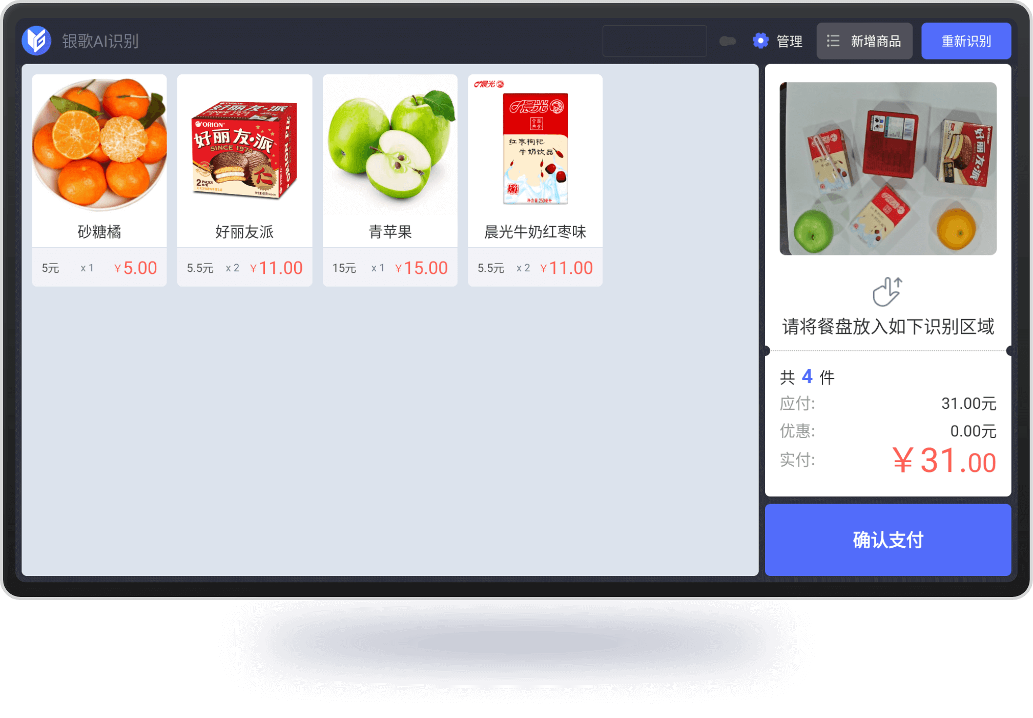 银歌AI4.0多物识别算法,商品识别计价一体化一步到位。精准识别餐盘、菜品、水果、饮料、零食、糕点等。