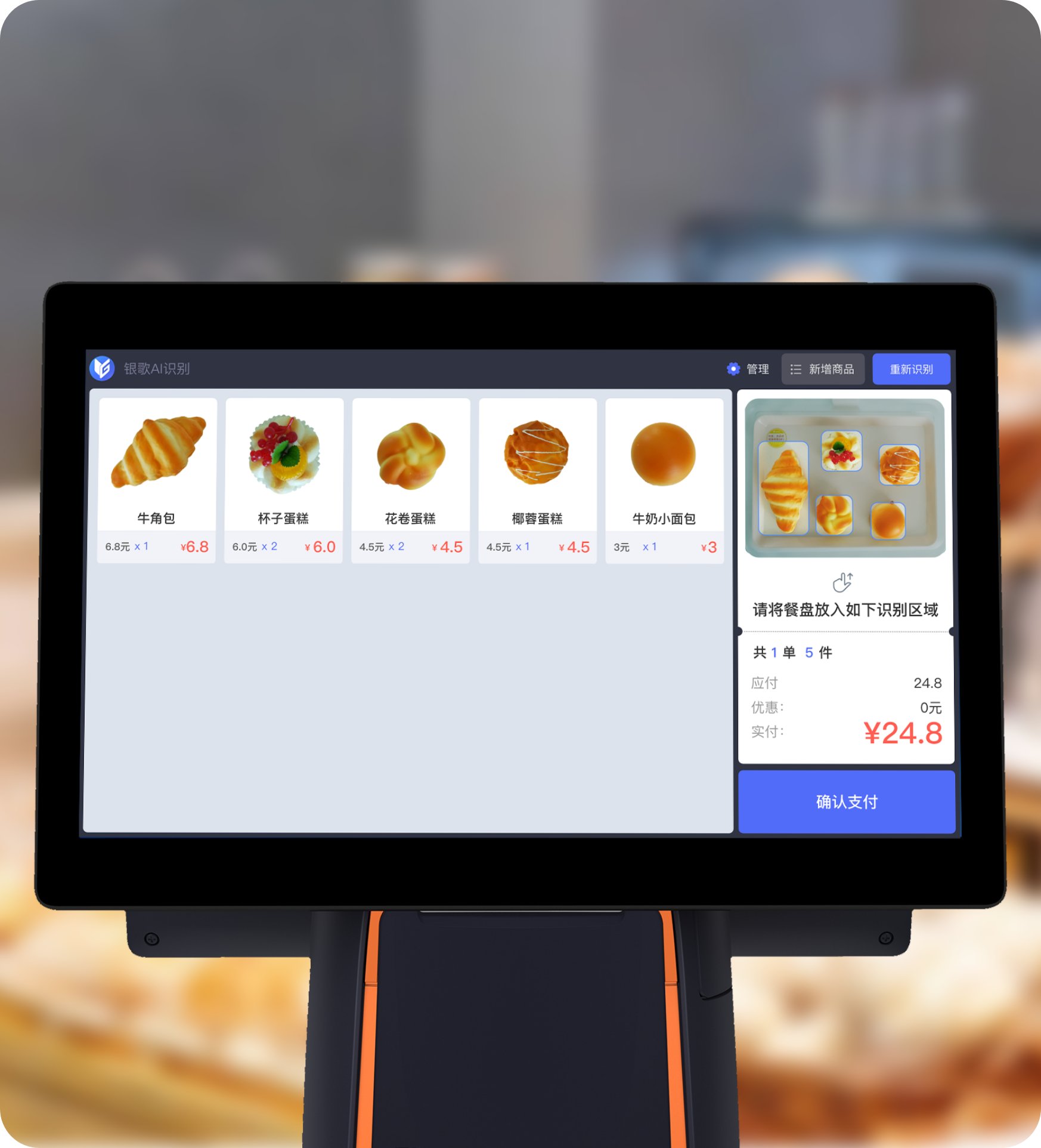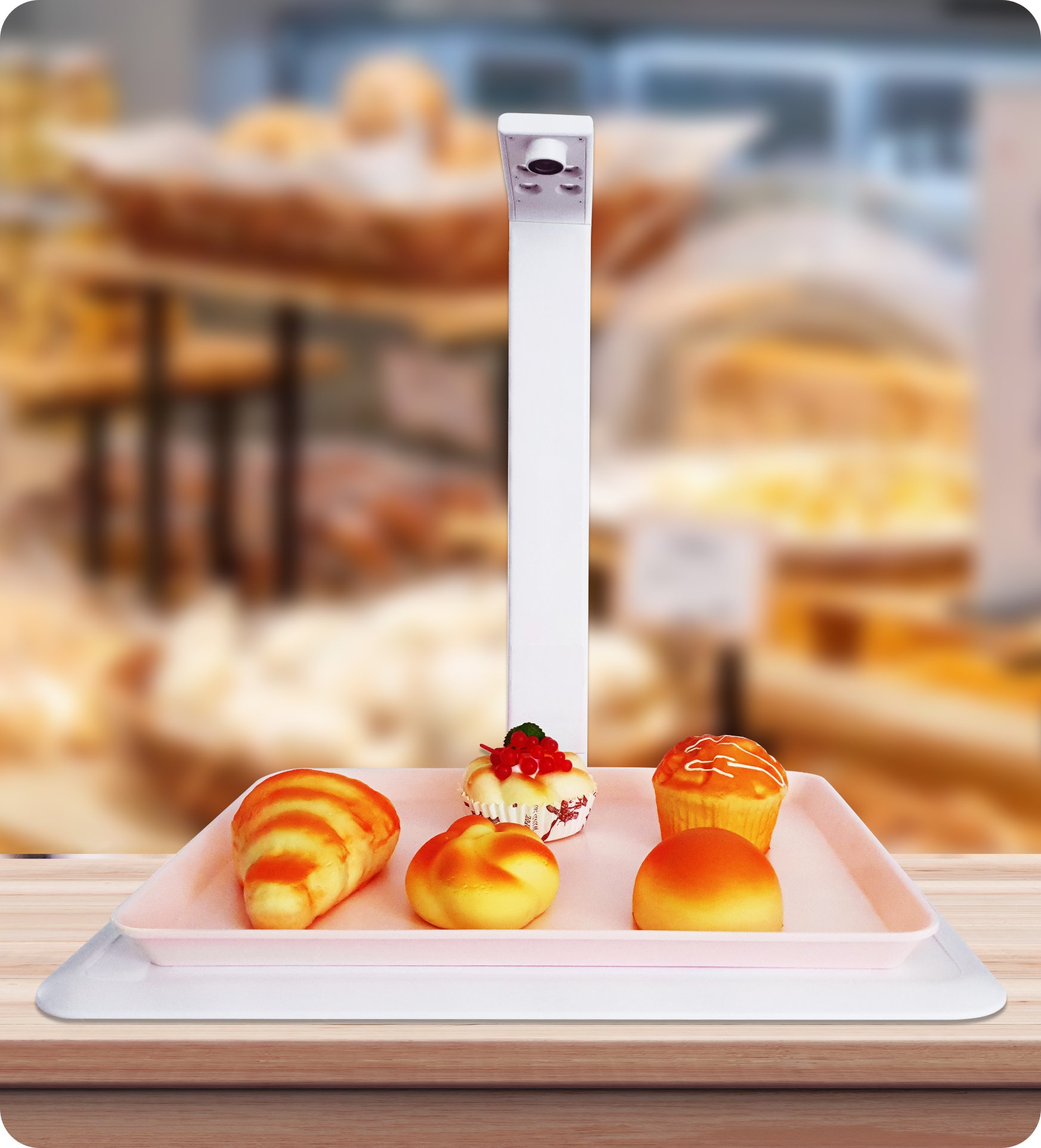 搭载银歌AI多物识别算法,0.08秒快速识别区域内商品,商品识别准确率>99%。 支持烘焙、餐饮、饰品、等识别。
